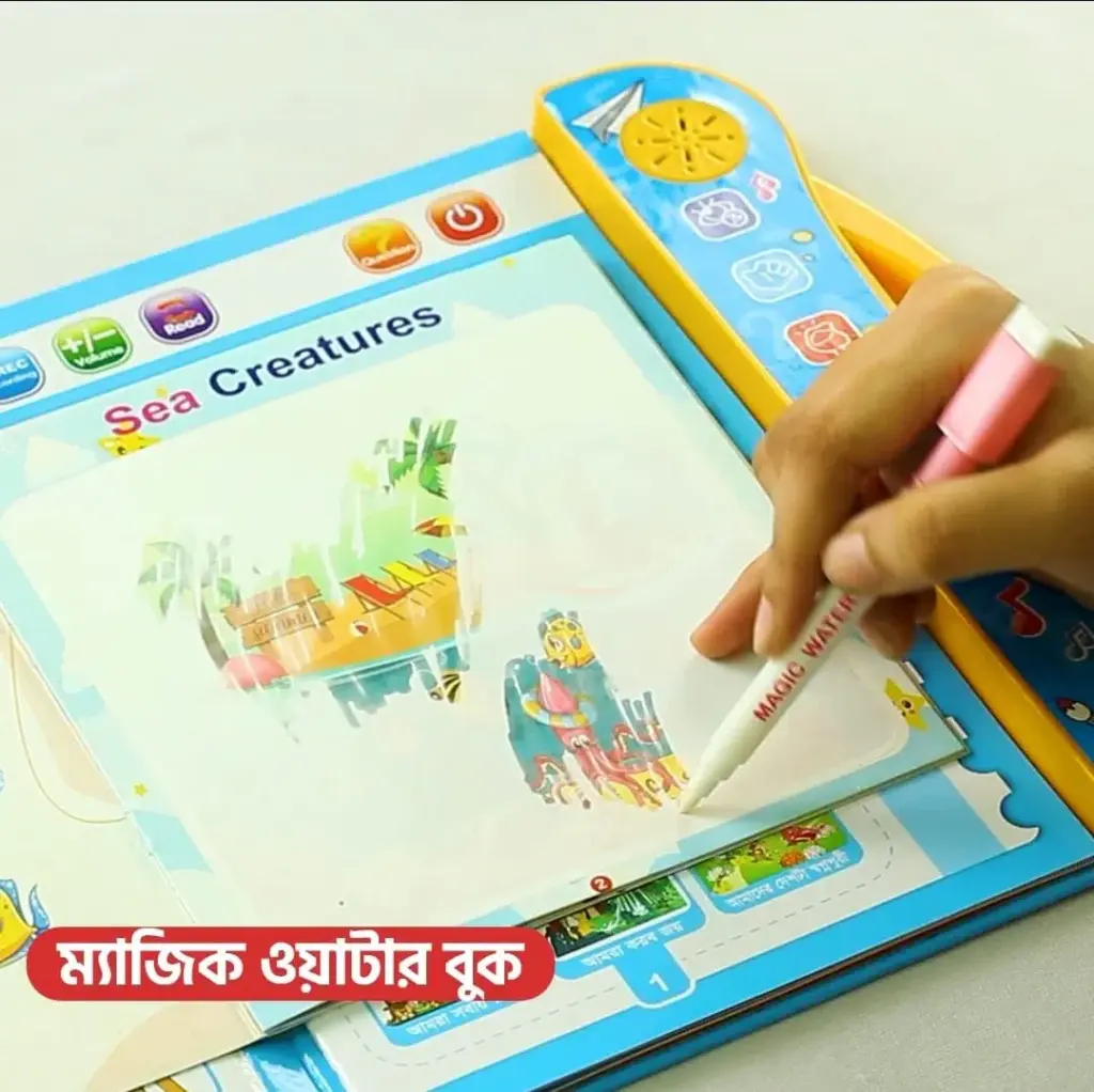 ম্যাজিক ওয়াটার বুক, যার সঙ্গে থাকা ম্যাজিক ওয়াটার পেনে পানি ভরে বাচ্চারা পাশের ছবিগুলোর সঙ্গে মিলিয়ে মজার ছলেই আর্ট করতে পারবে।
